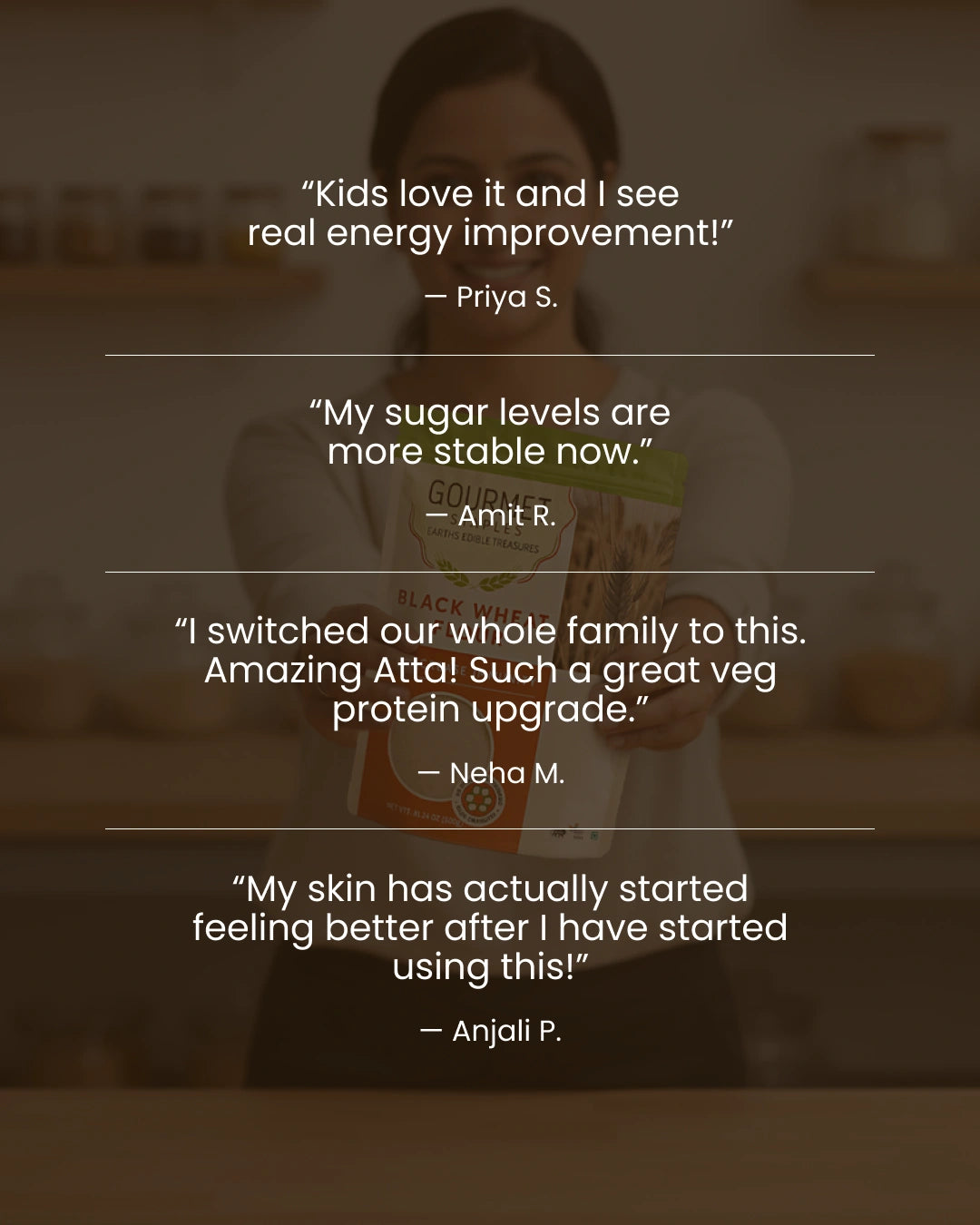 Black Wheat is a rare, bio-fortified, non-genetically modified variant of wheat that looks different because it is different. Unlike regular white wheat, it carries natural compounds called anthocyanins — the same antioxidants found in blueberries and black rice. This makes it nutrient-dense and linked with multiple health benefits, from improving digestion to reducing early sugar imbalances.